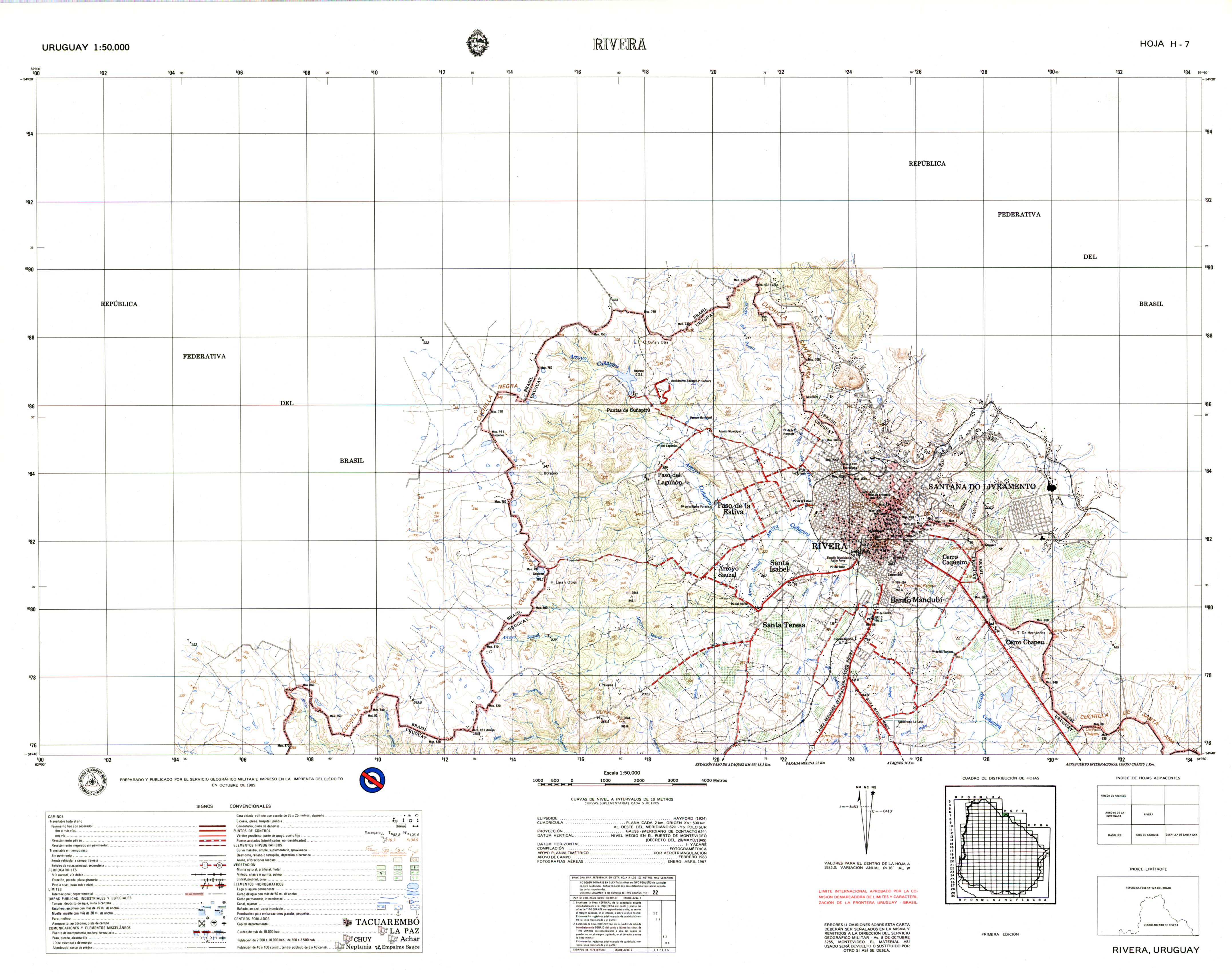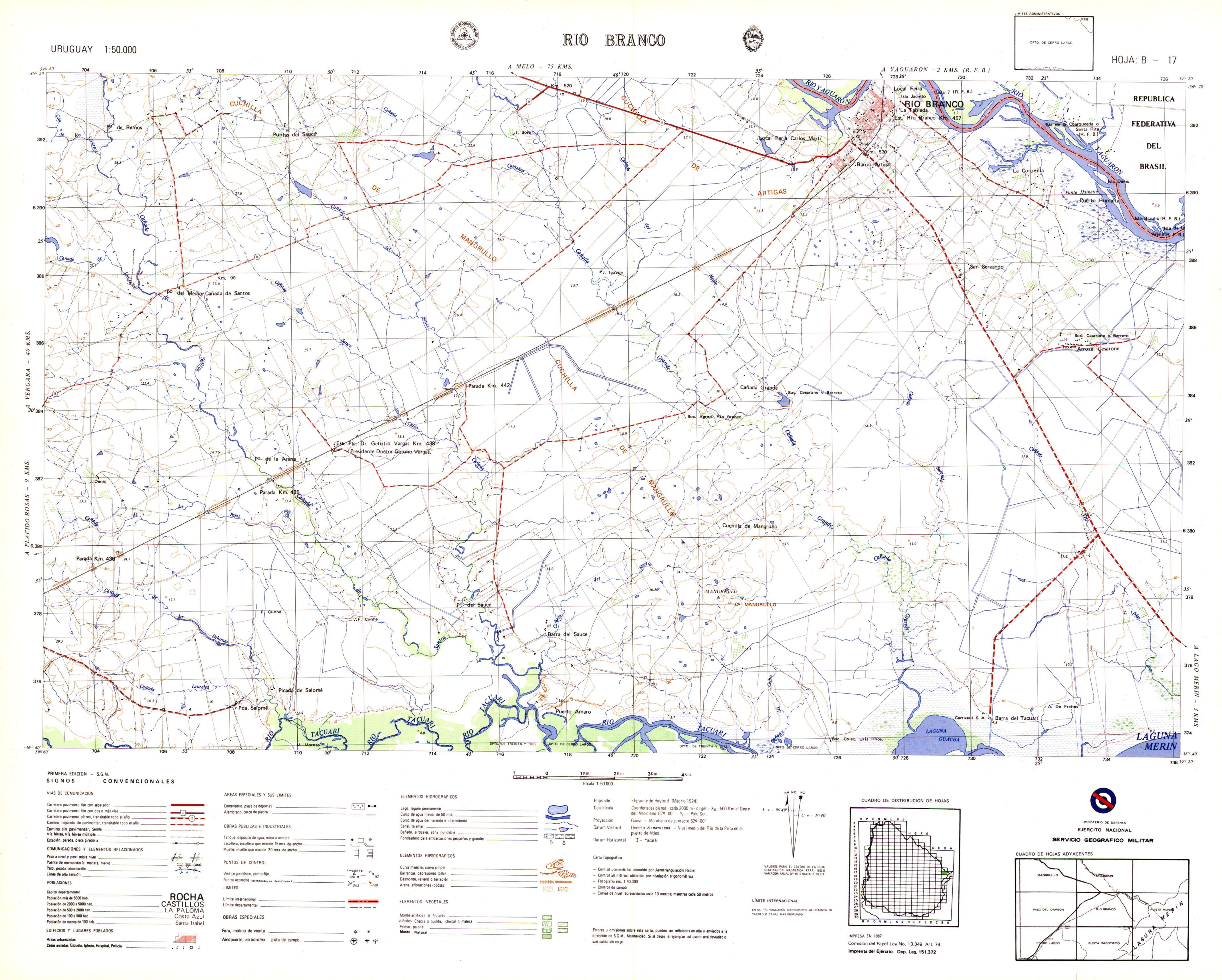 Título : Río Branco. Carta 1:100.000 Tipo de documento: documento cartográfico impreso Autores: Uruguay. Servicio Geográfico Militar, Autor Editorial: Montevideo: Servicio Geográfico Militar Fecha de publicación: 197? Il.: 76 x 56 cm. Nota general: Código local h 45, s AB-17-18 Idioma : Español (spa) Palabras clave: Río Branco, Cerro Largo, Uruguay, CAMINOS, FERROCARRIL, OBRAS PUBLICAS, RELIEVE, HIDROGRAFIA, VEGETACION, POBLADOS Clasificación: 918.5 Río Branco. Carta 1:100.000 [documento cartográfico impreso] / Uruguay. Servicio Geográfico Militar, Autor . - Montevideo: Servicio Geográfico Militar, 197? . - : 76 x 56 cm.