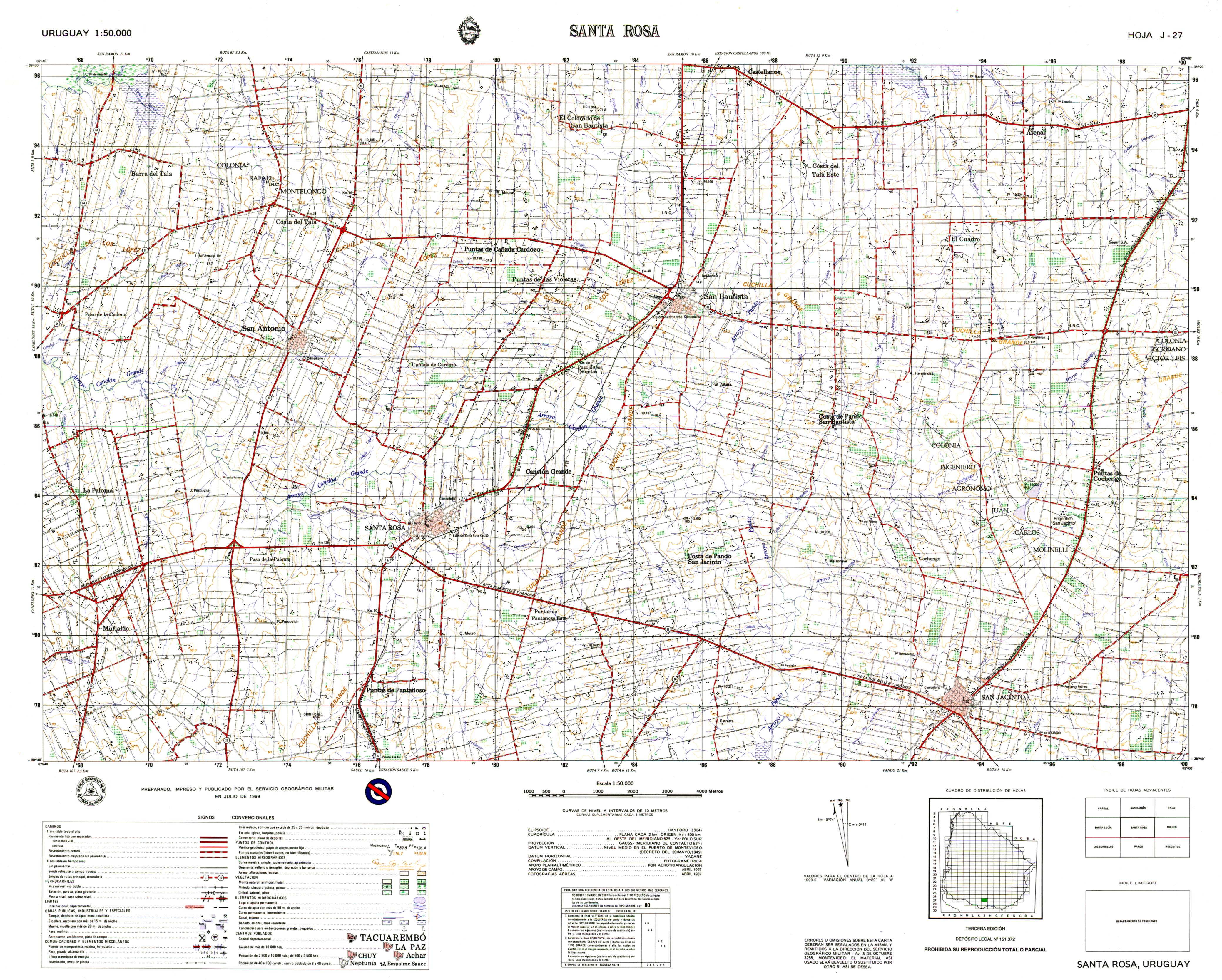 Título : Santa Rosa. Carta 1:50.000 Tipo de documento: documento cartográfico impreso Autores: Uruguay. Servicio Geográfico Militar, Autor Mención de edición: 2 Editorial: Montevideo: Servicio Geográfico Militar Fecha de publicación: 1985 Il.: 73 x 58 cm. Nota general: Código local J-27 Idioma : Español (spa) Palabras clave: Santa Rosa, Canelones, Uruguay, CAMINOS, FERROCARRIL, OBRAS PUBLICAS, RELIEVE, HIDROGRAFIA, VEGETACION, POBLADOS Clasificación: 918.5 Santa Rosa. Carta 1:50.000 [documento cartográfico impreso] / Uruguay. Servicio Geográfico Militar, Autor . - 2 . - Montevideo: Servicio Geográfico Militar, 1985 . - : 73 x 58 cm.