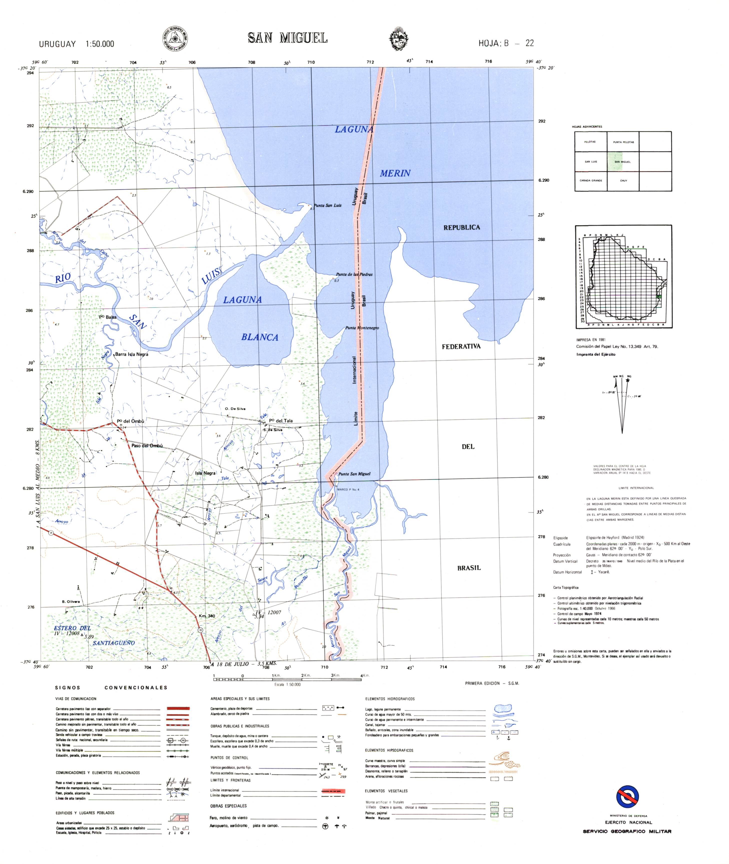 Título : San Miguel. Carta 1:100.000 Tipo de documento: documento cartográfico impreso Autores: Uruguay. Instituto Geográfico Militar, Autor Editorial: Montevideo: Servicio Geográfico Militar Fecha de publicación: 1980 Il.: 39 x 58 cm. Nota general: Código local h 61 Idioma : Español (spa) Palabras clave: San Miguel, Rocha, Uruguay, CAMINOS, FERROCARRIL, OBRAS PUBLICAS, RELIEVE, HIDROGRAFIA, VEGETACION, POBLADOS Clasificación: 918.5 San Miguel. Carta 1:100.000 [documento cartográfico impreso] / Uruguay. Instituto Geográfico Militar, Autor . - Montevideo: Servicio Geográfico Militar, 1980 . - : 39 x 58 cm.