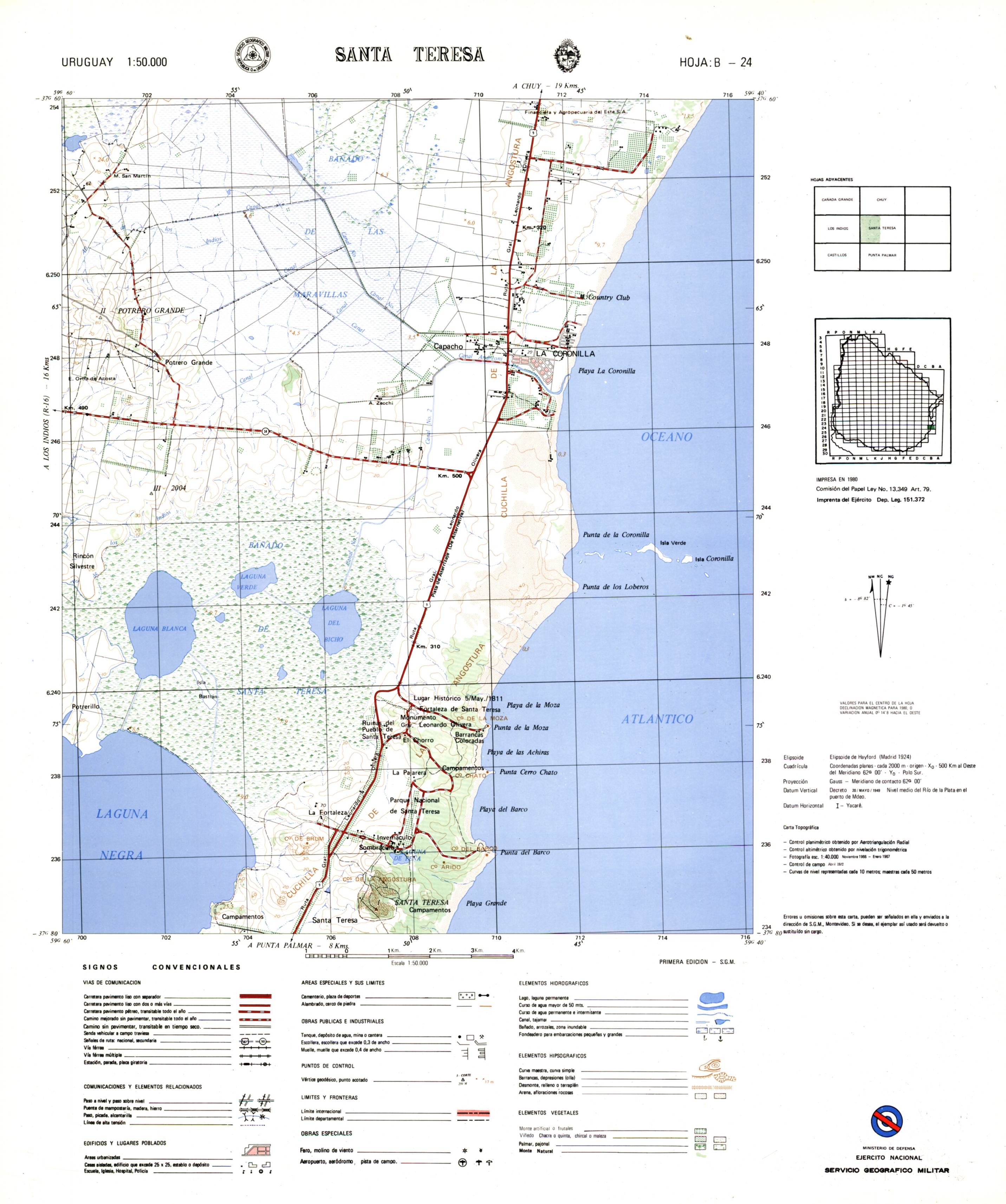 Título : Santa Teresa. Carta 1:50.000 Tipo de documento: documento cartográfico impreso Autores: Uruguay. Servicio Geográfico Militar, Autor Mención de edición: 1 Editorial: Montevideo: Servicio Geográfico Militar Fecha de publicación: 1980 Il.: 50 x 59 cm. Nota general: Código local B-24 Idioma : Español (spa) Palabras clave: Santa Teresa, Rocha, Uruguay, CAMINOS, FERROCARRIL, OBRAS PUBLICAS, RELIEVE, HIDROGRAFIA, VEGETACION, POBLADOS Clasificación: 918.5 Santa Teresa. Carta 1:50.000 [documento cartográfico impreso] / Uruguay. Servicio Geográfico Militar, Autor . - 1 . - Montevideo: Servicio Geográfico Militar, 1980 . - : 50 x 59 cm.